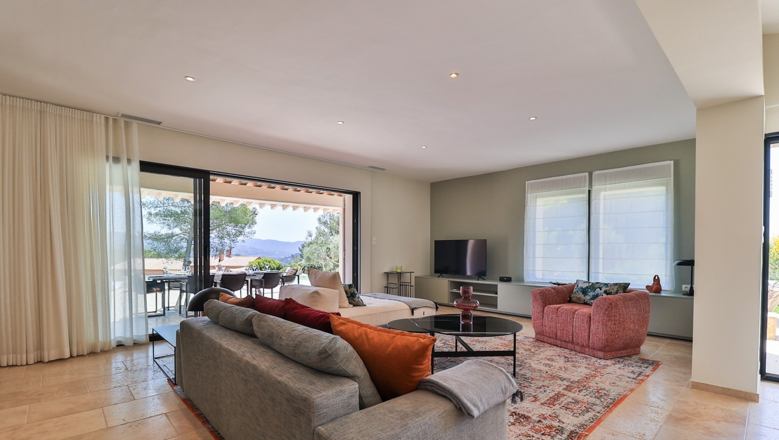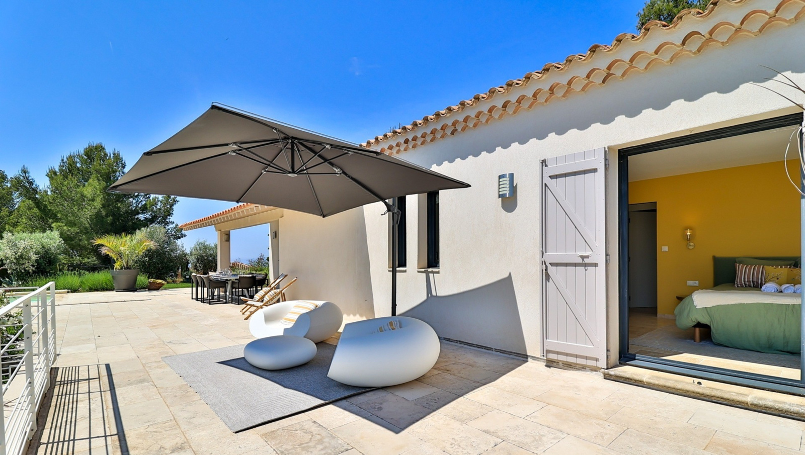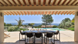 Terrasse pavées de travertin abritée ou non, aménagée pour réceptions privées et moments de détente