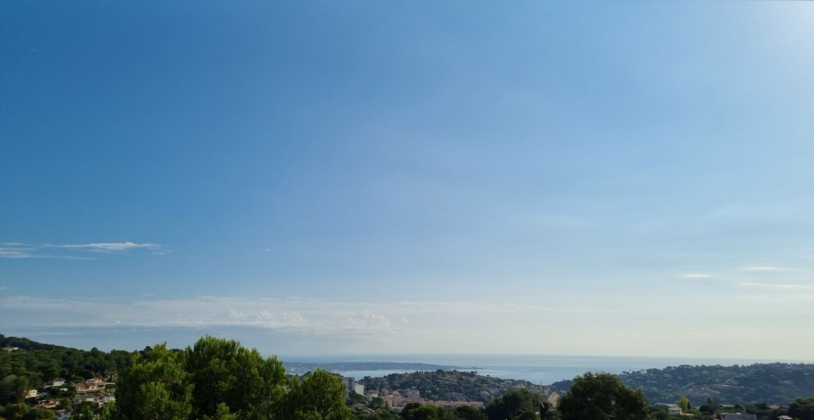 Le séjour double offre une vue mer panoramique, du Cap d’Antibes jusqu’à l’aéroport de Nice