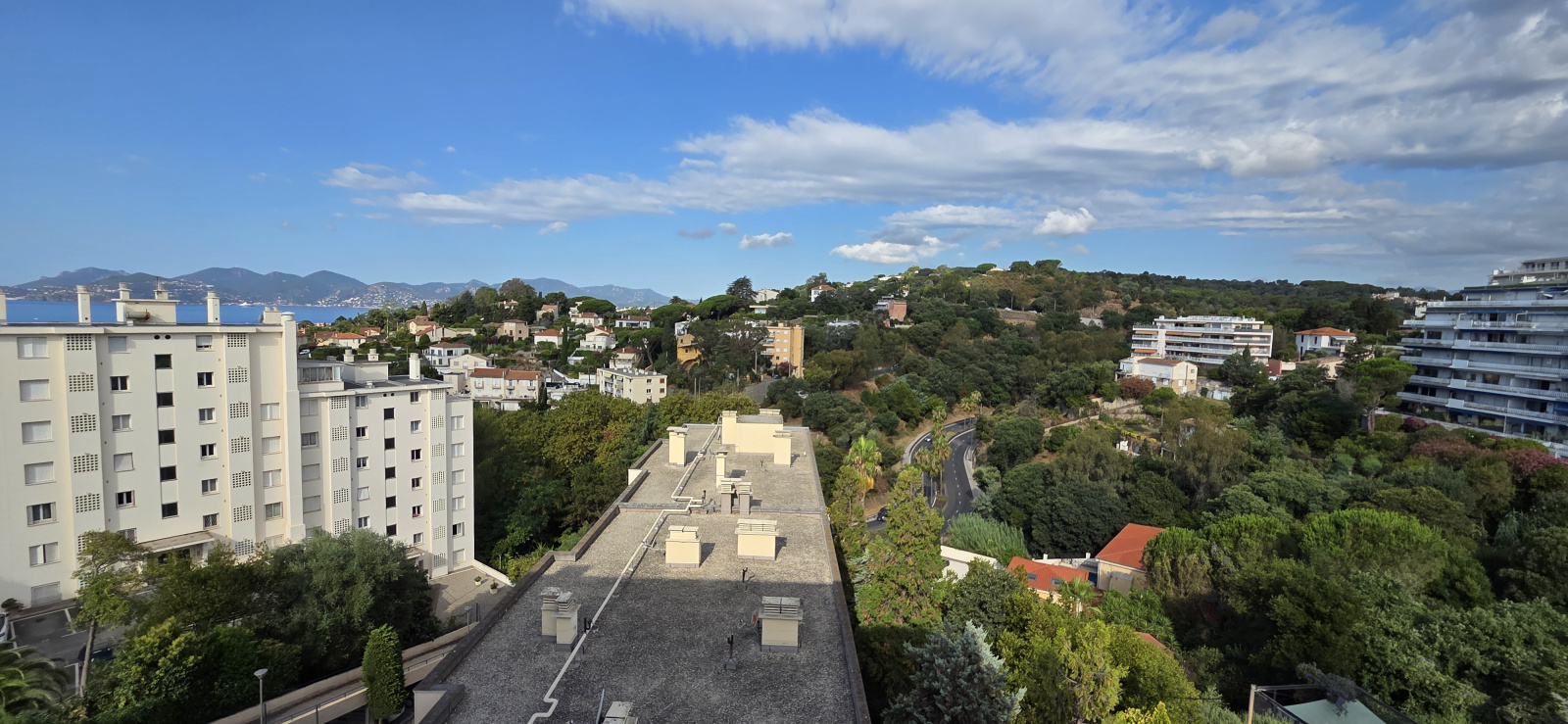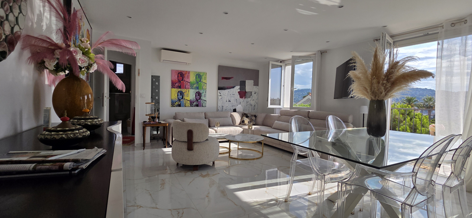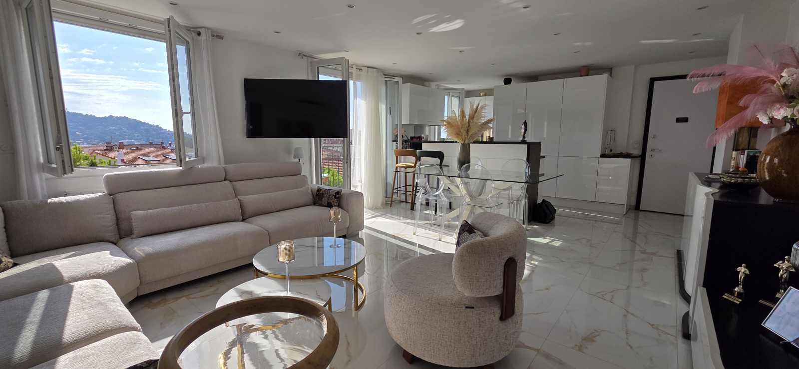 Vue dominante, traversante et dégagée sur la ville, les collines et la mer pour ce spacieux 3 pièces joliement rénové récemment.