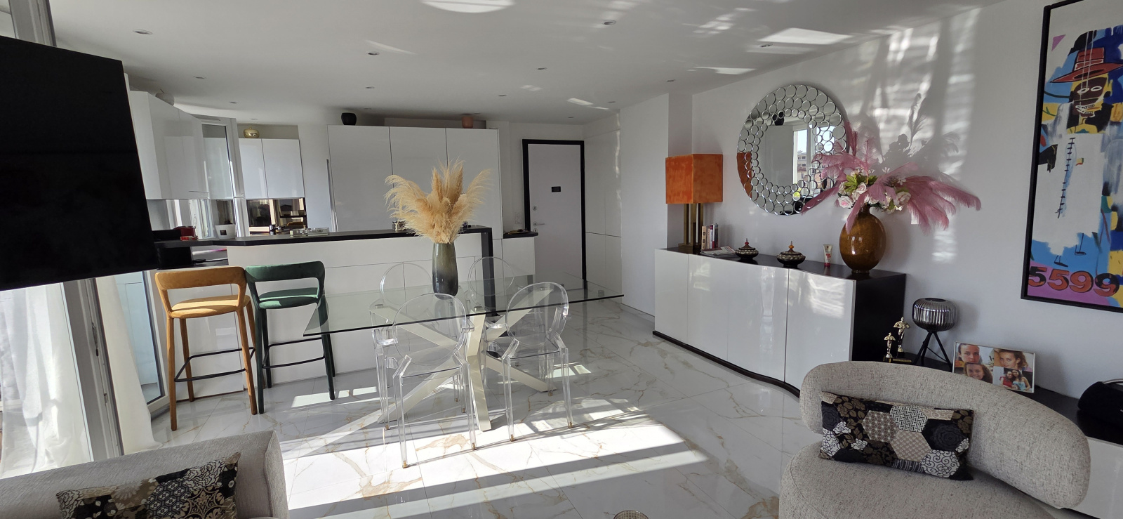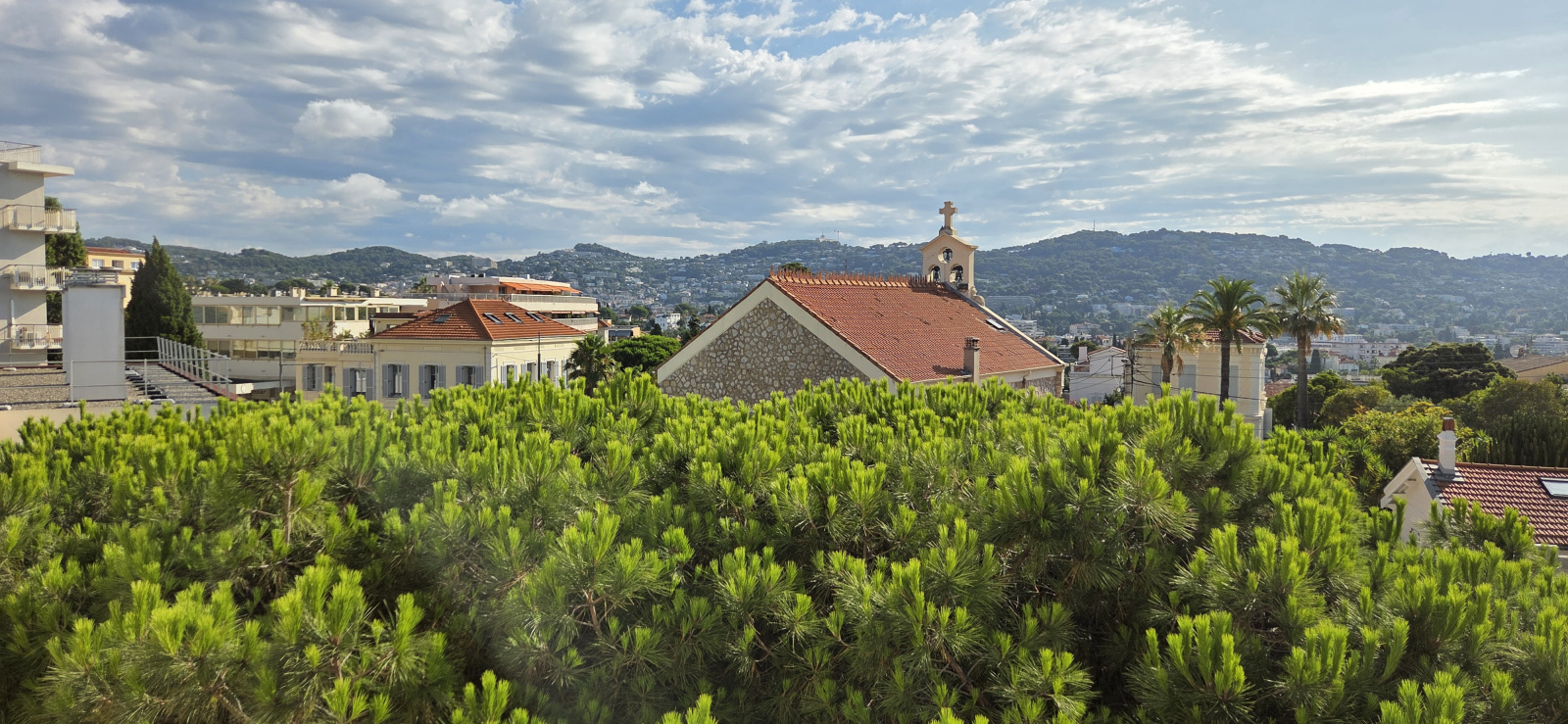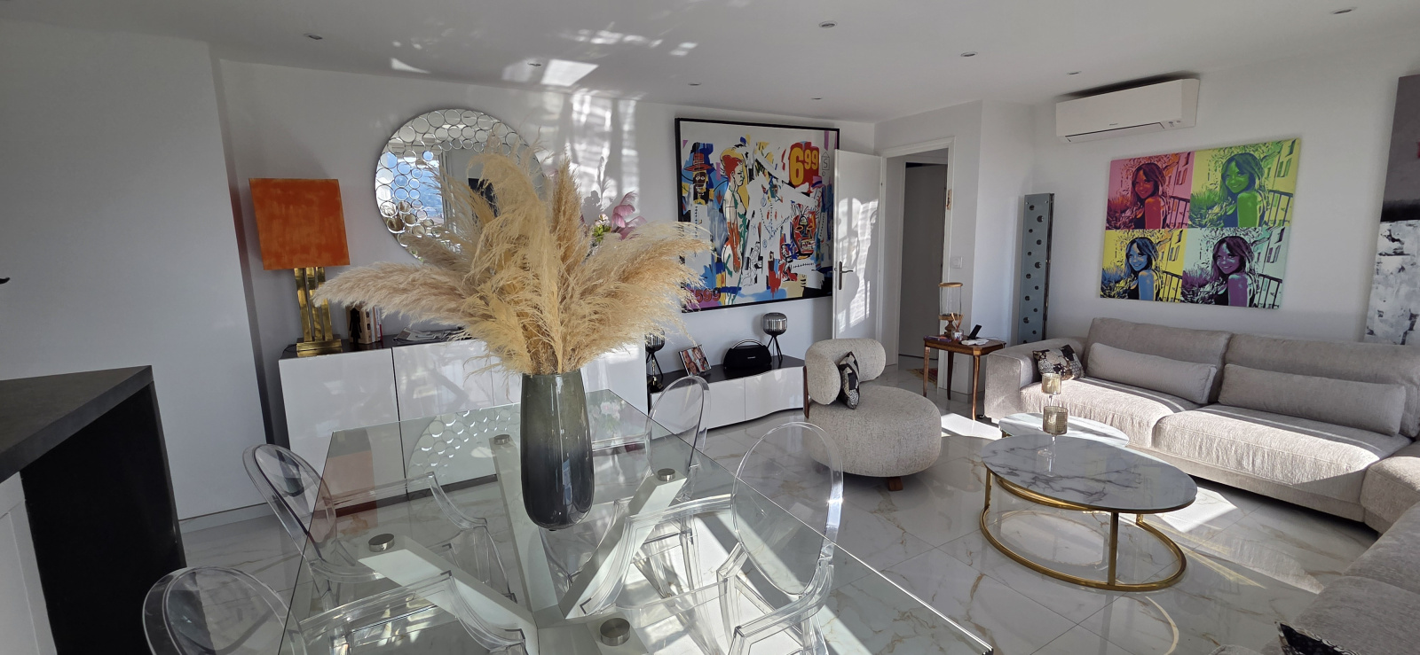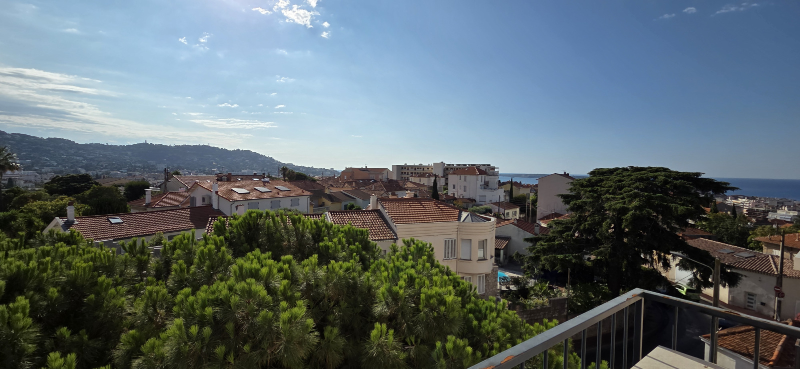 Vue dominante, traversante et dégagée sur la ville, les collines et la mer pour ce spacieux 3 pièces joliement rénové récemment.